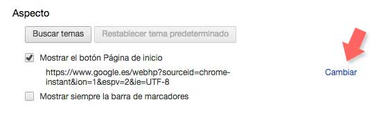 Una vez aquí tenemos que dirigirnos la sección de “aspecto” y hacer clic sobre el “mostrar el botón de página de inicio” y seleccionar “cambiar”