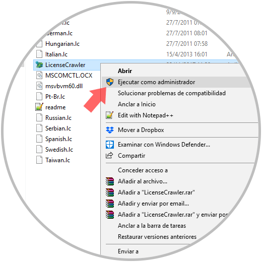 La descarga constará de un archivo comprimido y una vez extraído, debemos dar clic derecho sobre ele ejecutable LicenseCrawler y seleccionar la opción Ejecutar como administrador: