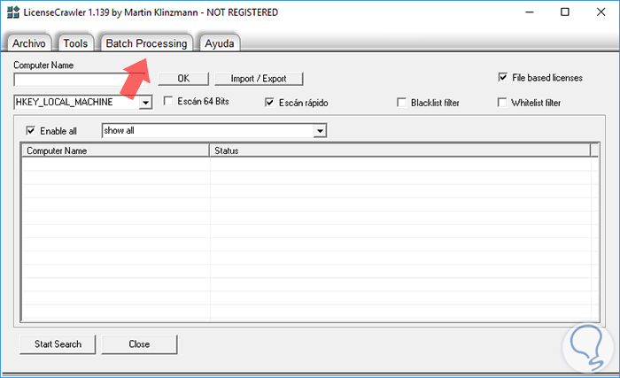 Pulsamos en Aceptar y seremos redireccionados a la siguiente ventana. LicenseCrawler nos ofrece soporte de red con lo cual será posible buscar claves en otro equipo conectado a la red desde el campo Ordenador.