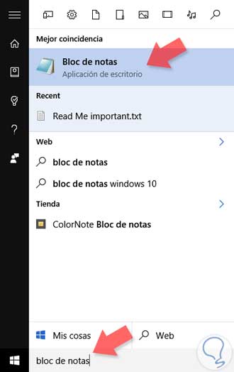 Abrir el bloc de notas, por lo que dirígete al buscador de Windows e introduce la palabra "bloc de notas". Después haz clic sobre la aplicación Notepad para que se abra.