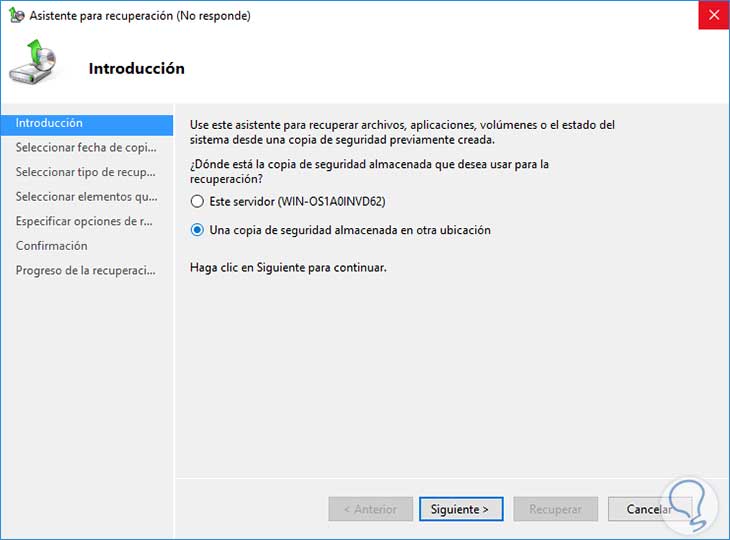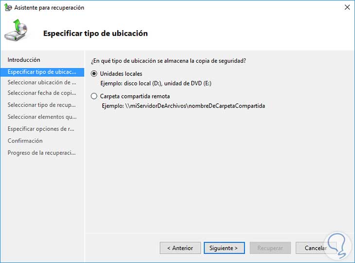 Vemos que es una ventana informativa acerca del proceso de recuperación. Pulsamos Siguiente y en la siguiente ventana debemos definir en donde tenemos la copia de seguridad, pueden ser unidades locales o remotas, en este caso son unidades locales.