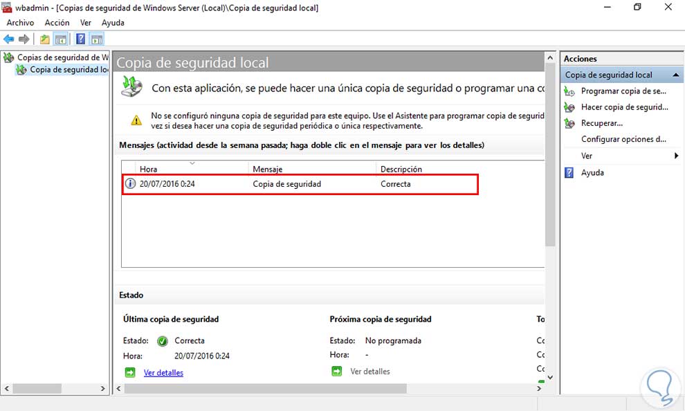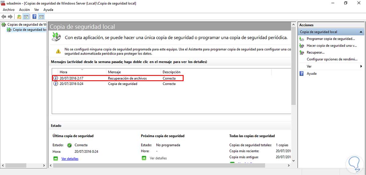 Cuando veamos la ventana central de Windows Server Backup podremos ver que la restauración ha sido correcta.
