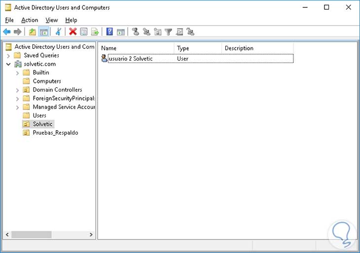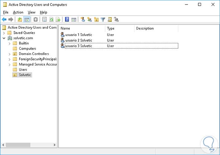 Hemos creado una OU llamada Solvetic y dentro de ella tenemos los siguientes usuarios: