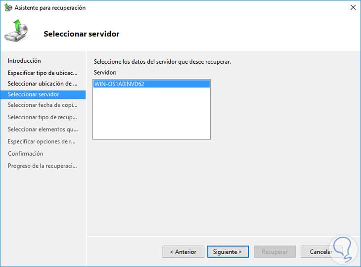 Una vez definamos la ubicación de la copia de seguridad pulsamos Siguiente y en la siguiente ventana debemos definir el servidor sobre el cual se van a recuperar los datos.