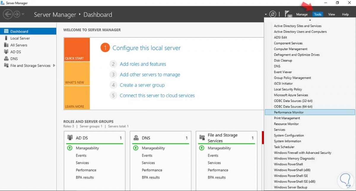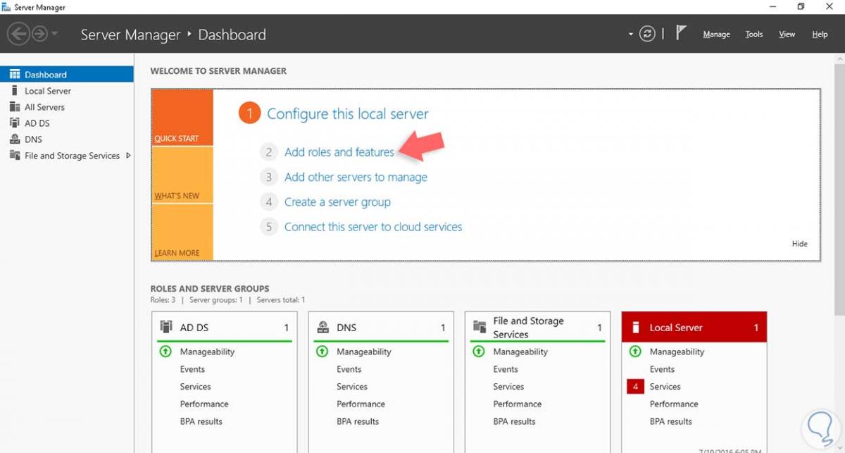Para comenzar el proceso de respaldo vamos a ir a la opción Agregar roles y características o Add roles and features desde el Server manager.