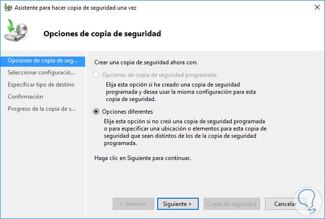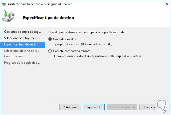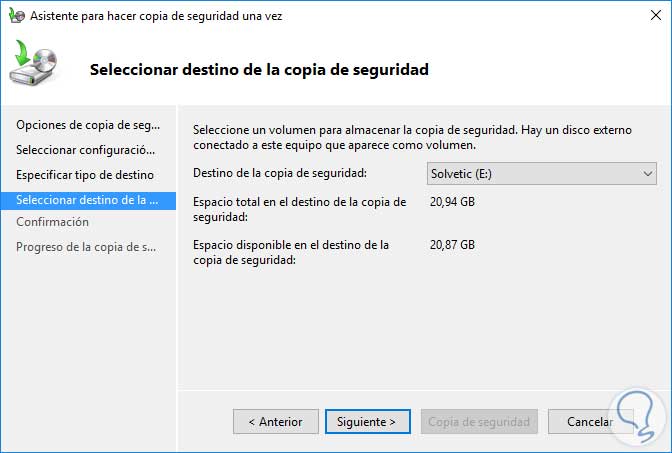 Pulsamos Siguiente y debemos seleccionar el destino donde hemos de guardar la copia de respaldo.