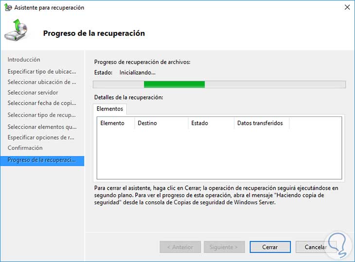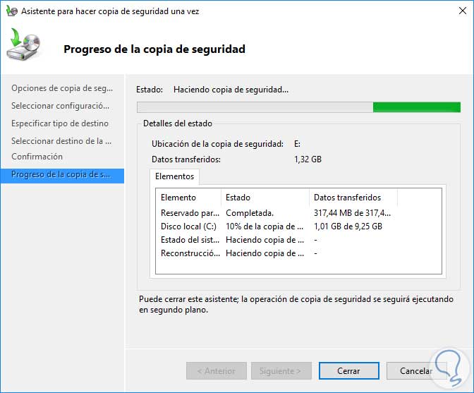 Podemos ver los elementos que serán respaldados. Para iniciar el respaldo pulsamos el botón Copia de seguridad y comenzará el respaldo de nuestro equipo Windows Server 2016. Podemos seguir el proceso de respaldo: