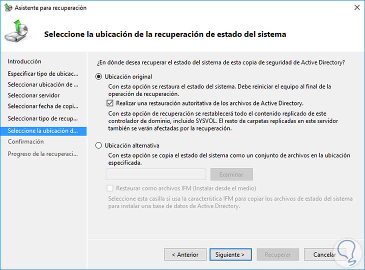 Cuando tengamos claro que vamos a recuperar pulsamos Siguiente y en la siguiente ventana indicamos donde se ha de almacenar la restauración, dejamos el valor por defecto que es Ubicación original y marcamos la casilla “Realizar una restauración autoritativa de los archivos de Active Directory” con el fin de que reemplace los elementos actuales por los del respaldo.