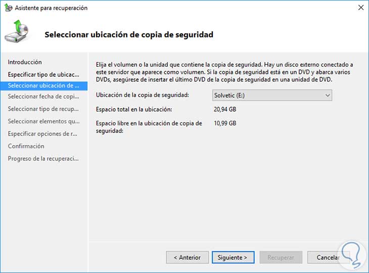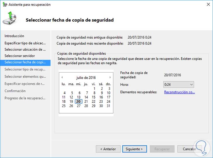 De nuevo pulsamos Siguiente y vamos a seleccionar la fecha en la cual se creó la recuperación que deseamos.