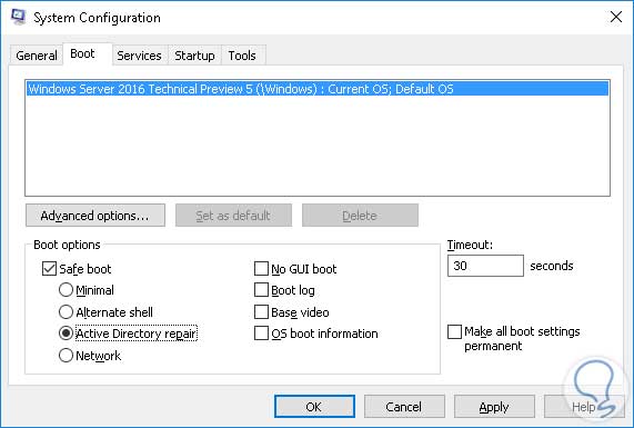 Allí debemos ir a la ficha Boot (Arranque), activar la casilla Safe Boot y seleccionar la opción Active Directory Repair.