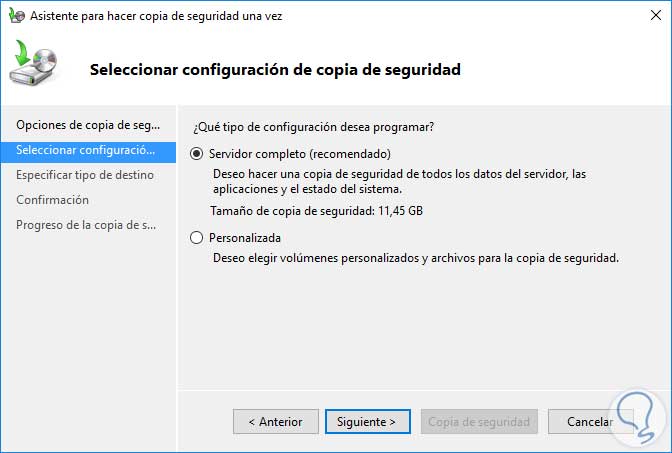 Allí podemos elegir el tipo de respaldo a realizar, podemos seleccionar Servidor completo para respaldar todo el sistema o podemos elegir Personalizada para configurar según nuestro gusto lo que deseamos respaldar. Seleccionamos Servidor completo la cual viene por defecto y pulsamos Siguiente. A continuación definimos donde se ha de almacenar la copia, localmente o remotamente.