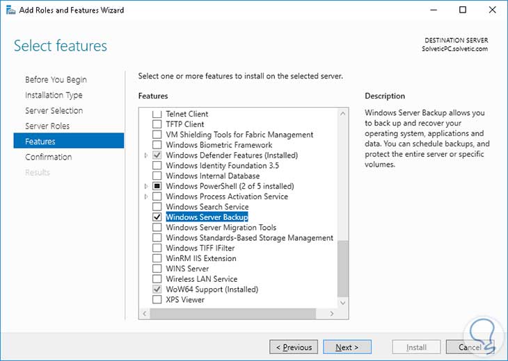 Con esta herramienta tendremos la posibilidad de crear copias de seguridad y restauración de múltiples parámetros en nuestro equipo Windows Server 2016. Una vez seleccionada pulsamos Siguiente y continuamos con la instalación de la característica. Una vez finalizada la instalación podremos ver la herramienta desde el menú Herramientas o Tools en el Server manager.