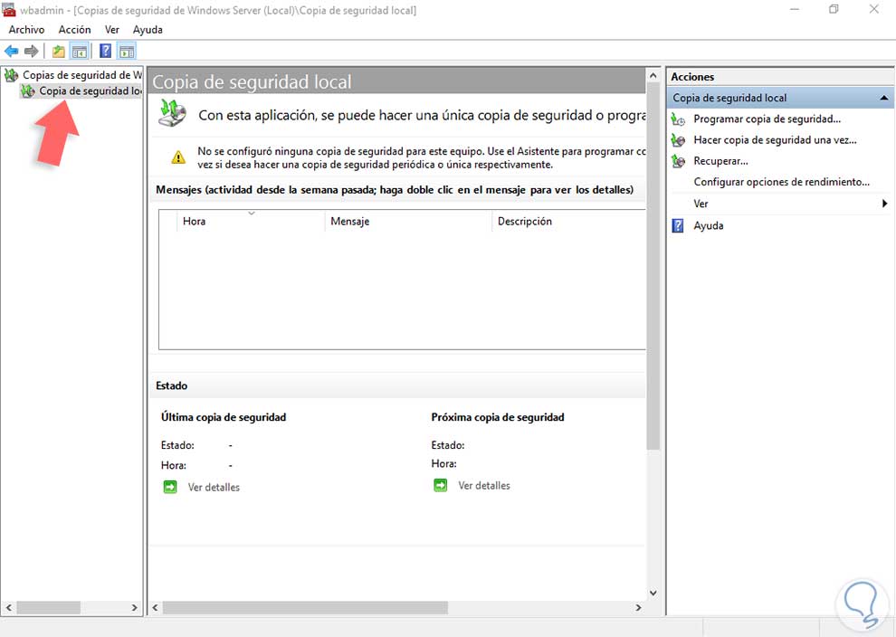 Con estos parámetros vamos a abrir la herramienta Windows Server Backup desde la opción Herramientas en el administrador del servidor. Para iniciar el respaldo de nuestro Windows Server 2016 vamos a dar clic en la opción Copia de seguridad local y veremos que se despliega la siguiente ventana: