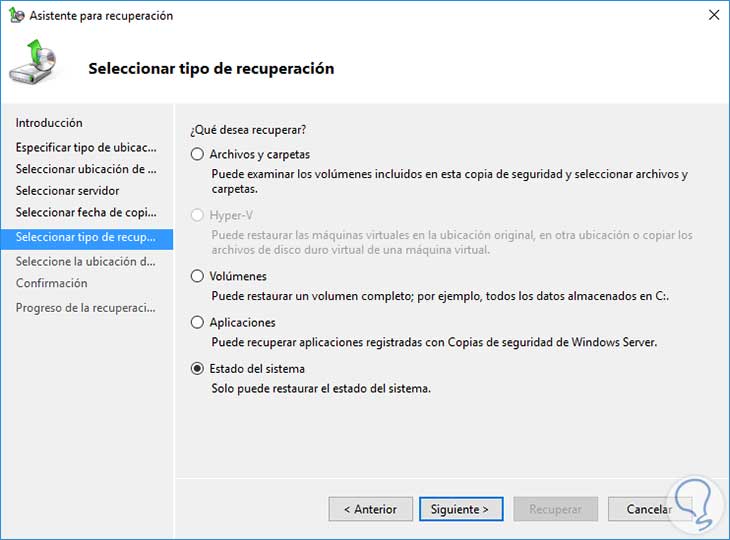 Una vez establezcamos la fecha correcta pulsamos Siguiente y elegimos que tipo de elementos vamos a recuperar, podemos recuperar archivos y carpetas, volúmenes, aplicaciones, etc. En este caso para recuperar los elementos que eliminamos del directorio activo debemos seleccionar la opción Estado del sistema.