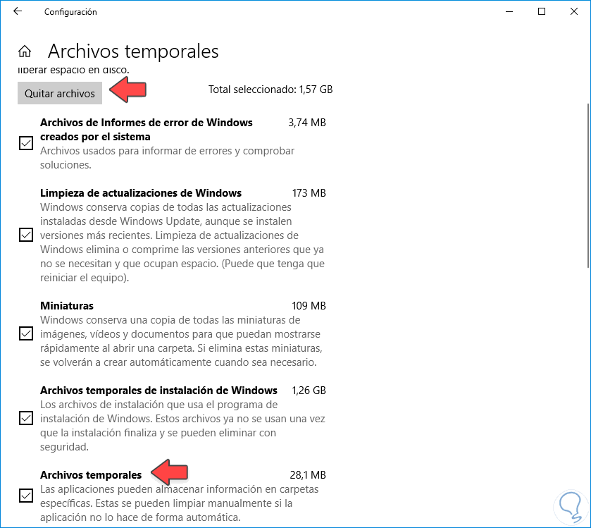 Dentro de estos Archivos temporales encontramos de nuevo varios tipos. El que nos interesa en este caso es precisamente el que se denomina Archivos temporales. Una vez aquí podremos borrarlos si hacemos clic en “Quitar archivos”. Te preguntará si estás seguro así que pulsa en Sí.