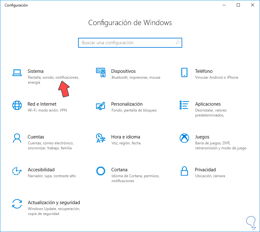 Lo primero que haremos será ir al menú de Inicio haciendo clic sobre el botón menú de Windows. En el menú desplegable de Inicio haz clic en la opción de Configuración. En la siguiente ventana que aparece selecciona la opción de Sistema para acceder a su configuración.