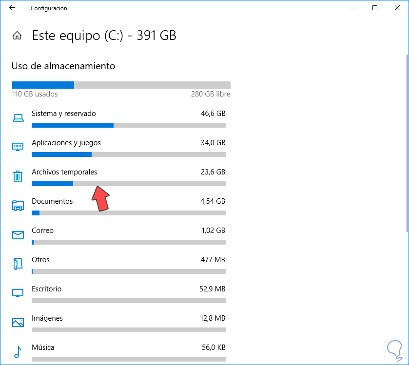 Una vez dentro, verás que te desglosa la memoria de tu ordenador en función de la categoría. Si te desplazas hacia abajo encontrarás la opción de Archivos temporales, haz clic en ella.