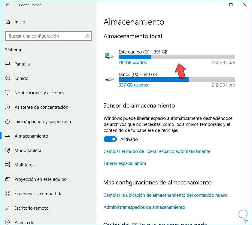 En esta ventana selecciona en el menú de la izquierda el apartado de Almacenamiento y en la derecha Este equipo ya que es donde está instalado nuestro Windows 10.