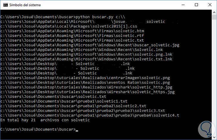 El siguiente paso es un bucle, la función os.walk(directorio) leerá los nombres de los archivos recursivamente, es decir recorrerá los ficheros y directorios desde el directorio que le pasemos. Después lo único que nos interesa en este ejemplo es mostrar los archivos que contengan la palabra solvetic, por lo que recorreremos los ficheros y comprobaremos si tienen la palabra buscada, para encontrar también los archivos que contengan la palabra con alguna mayúscula usamos la función lower, que lo único que hace es dejar la cadena al completo en minúsculas. Como nos interesa ver la ruta completa del archivo concatenamos la variable root con el fichero, ya que root nos devuelve el directorio que hemos leído.