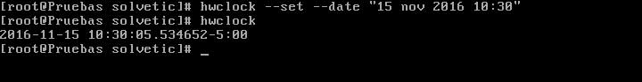 Con hwclock accedemos al RTC o reloj del hardware, este reloj de hardware contiene los valores de año, mes, día, horas, minutos y segundos. Para ajustar algún parámetro como la fecha o la hora usando el comando hwclok vamos a usar la siguiente sintaxis: