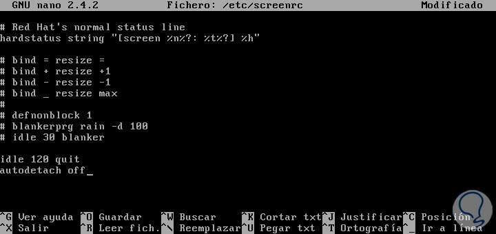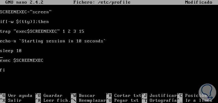 Guardamos los cambios con Ctrl + O. Si deseamos bloquear la sesión en vez de cerrarla ingresaremos el siguiente texto: