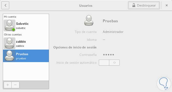 Del mismo modo si deseamos eliminar un usuario desde el entorno gráfico simplemente debemos seleccionar el usuario y pulsar el ícono -.