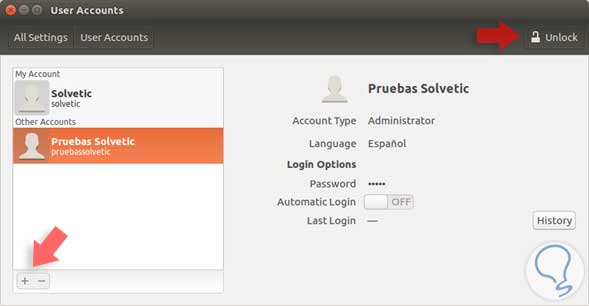 Para crear un usuario debemos pulsar en el botón Desbloquear (Unlock) para habilitar la edición de usuarios. Es necesario ingresar nuestro password para permitir la edición.