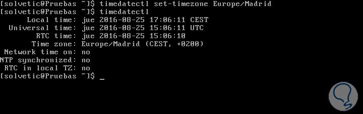 timedatectl set-timezone time_zone, por ejemplo, timedatectl set-timezone Europe/Madrid