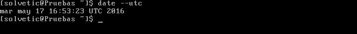 Como vemos usando el comando date se despliega información básica como el día, la fecha y la hora actual. Si deseamos ver el tiempo en formato UTC debemos ingresar el siguiente comando: