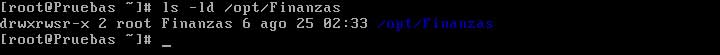 Hasta este punto todos los usuarios del grupo Finanzas podrán editar los archivos almacenados en la ruta /opt/Finanzas/ sin necesidad que como administradores tengamos que asignar permisos a cada momento. Para verificar que los permisos fueron otorgados de manera correcta vamos a ejecutar el siguiente comando:
