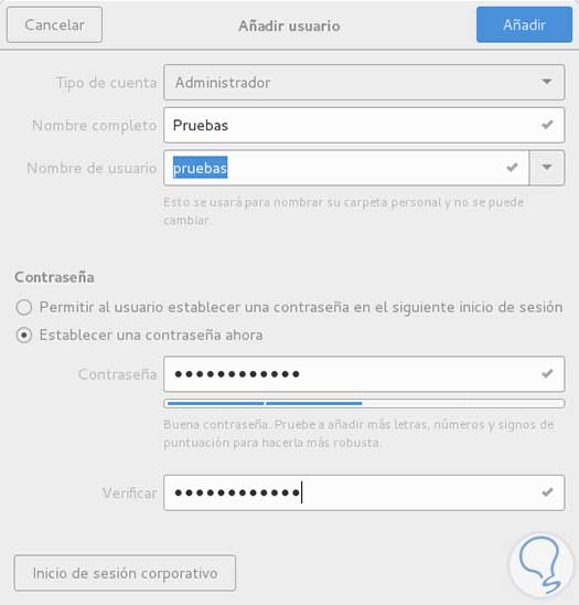 Configuramos los parámetros necesarios del usuario tal como usuario estándar o administrador y damos clic en Añadir y de esta manera nuestro usuario ha sido añadido al sistema. Podemos ver el nuevo usuario creado de manera satisfactoria:
