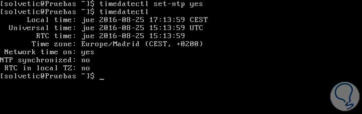 Si ejecutamos timedatectl veremos que ya ha sido habilitado el NTP (Network Time Protocol). Aquí terminamos con la utilidad de la línea de comandos timedatectl.