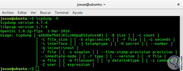 man tcpdumpUsar este comando es más completo que la ayuda que nos ofrece el parámetro -h o --help, que solo nos mostraría lo siguiente: