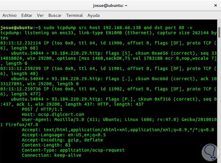 sudo tcpdump host 192.168.66.130 -vA continuación se muestra una imagen en la que se utiliza el comando anterior: