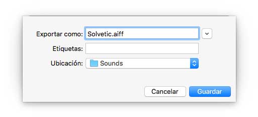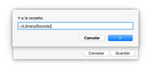 Una vez se abra la ventana para guardar nuestro archivo vamos a pulsar la combinación de teclas Comando + Shift + G para especificar una ruta especial donde se almacenan los archivos de sonido, allí ingresamos lo siguiente: