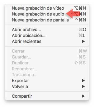 Una vez abierto QuickTime Player seleccionaremos la opción Nueva grabación de audio desde el menú Archivo.