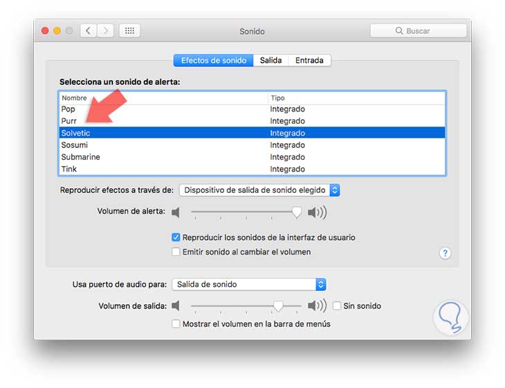 Para visualizar el sonido que hemos creado vamos a ir nuevamente a Preferencias del sistema / Sonido y veremos el sonido Solvetic adicionado dentro del menú a elegir.