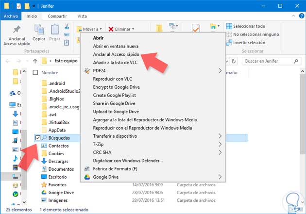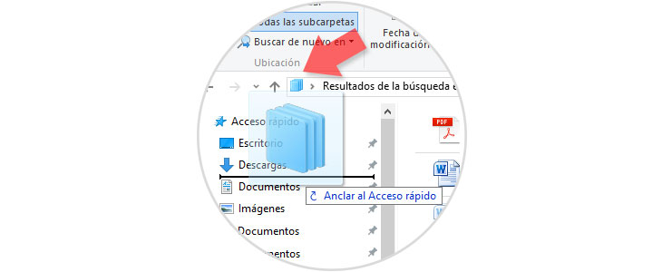 Otra forma de crear un acceso directo a una búsqueda en concreto es realizar una búsqueda en el explorador de Windows, pinchar sobre el icono que aparece y arrastrarlo al menú de acceso rápido. Ahora pincha sobre la búsqueda que quieres tener más a mano.