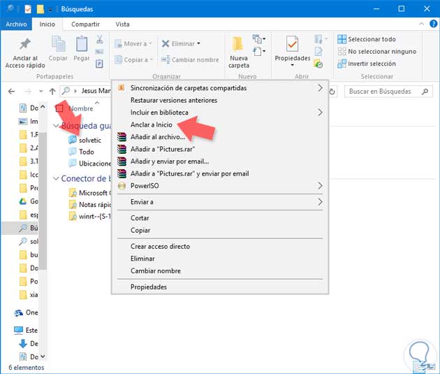 Dirígete a la carpeta de Búsquedas, selecciona con clic derecho la búsqueda guardada a la que quieres poner acceso directo y elige la opción de Anclar a Inicio.