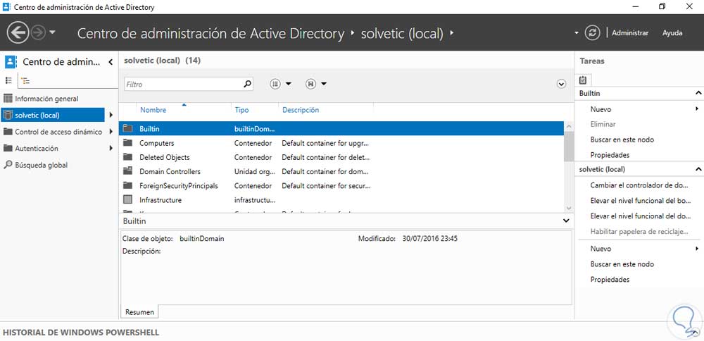 Ingresamos al menú Herramientas en el Administrador del servidor y allí seleccionamos la opción Centro de administración de Active Directory.