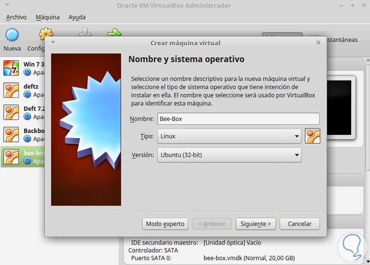 En este tutorial instalaremos la versión Bee-Box de bWAPP, para ello descomprimimos el archivo que descargamos y los creara una carpeta con muchos archivos vmdk a nuestro servidor local. A continuación crearemos la máquina virtual asignando una versión Linux Ubuntu de 32 bit.