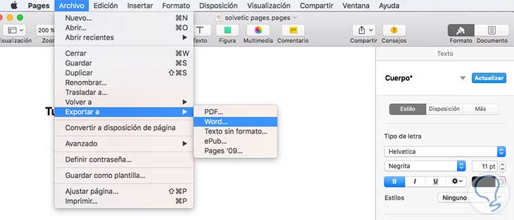Lo primero que tenemos que hacer es abrir el cual documento el cual queremos convertir. Una vez que lo tenemos abierto, tenemos que dirigirnos al menú “Archivo” y seleccionar “Exportar a Word“