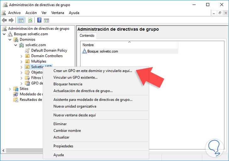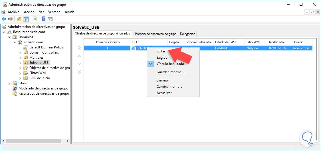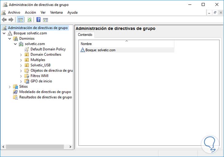 Para este análisis hemos creado una unidad organizativa llamada Solvetic_USB. En el editor de políticas de grupo vamos a desplegar nuestro dominio para ver dicha unidad organizativa.