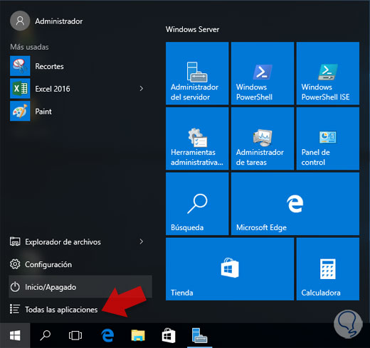 Para abrir el editor y de esta manera configurar la respectiva GPO vamos a ir al menú Inicio y seleccionamos la opción "Todas las aplicaciones".
