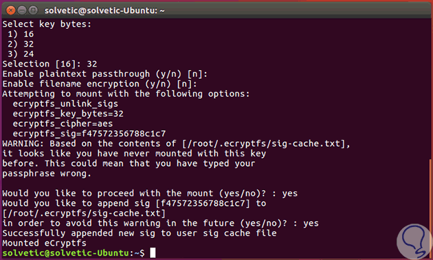 /home/solvetic_seguro on /home/solvetic_seguro type ecryptfs (rw,relatime,ecryptfs_sig=f47572356788c1c7,ecryptfs_cipher=aes,ecryptfs_key_bytes=32,ecryptfs_unlink_sigs)