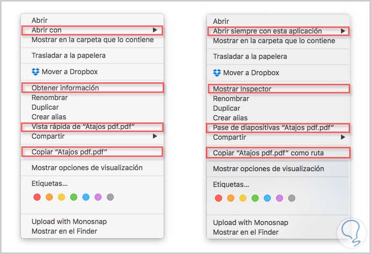 Lo primero que debes hacer es lo que por lo general haces para abrir el menú contextual de una archivo, es decir, hacemos clic en el botón derecho. En este caso vamos a poner de ejemplo un PDF. La diferencia en esta ocasión es que la tecla Option (Alt) en esta ocasión también va a ser presionada.