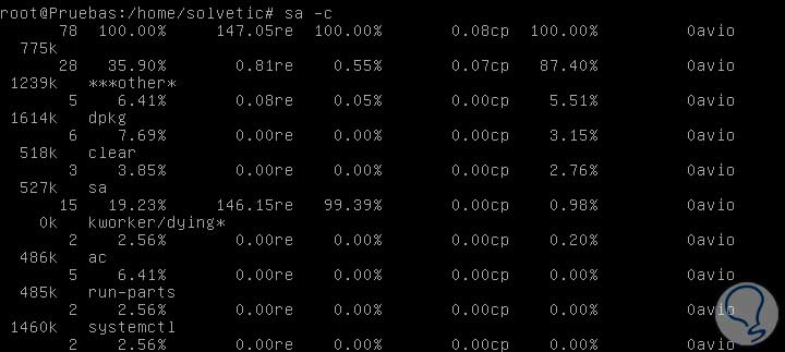 Esto nos permite ver un control sobre los procesos que se están ejecutando ya que si estos valores se incrementan es señal que algo anda mal. Si estos valores los queremos ver en formato de porcentaje podemos usar la sintaxis sa -c: