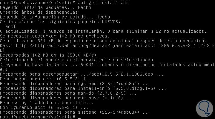 sudo apt-get install acct o apt-get install acctAceptamos la descarga y esperamos que las mismas sean instaladas en el Sistema.