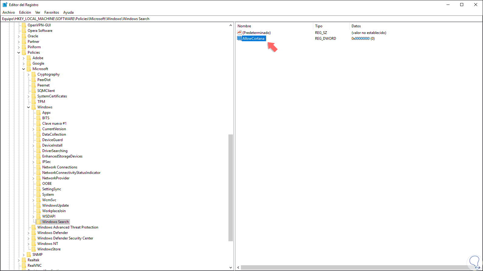 2. Desactivar Cortana usando el Editor de Registros de Windows 10