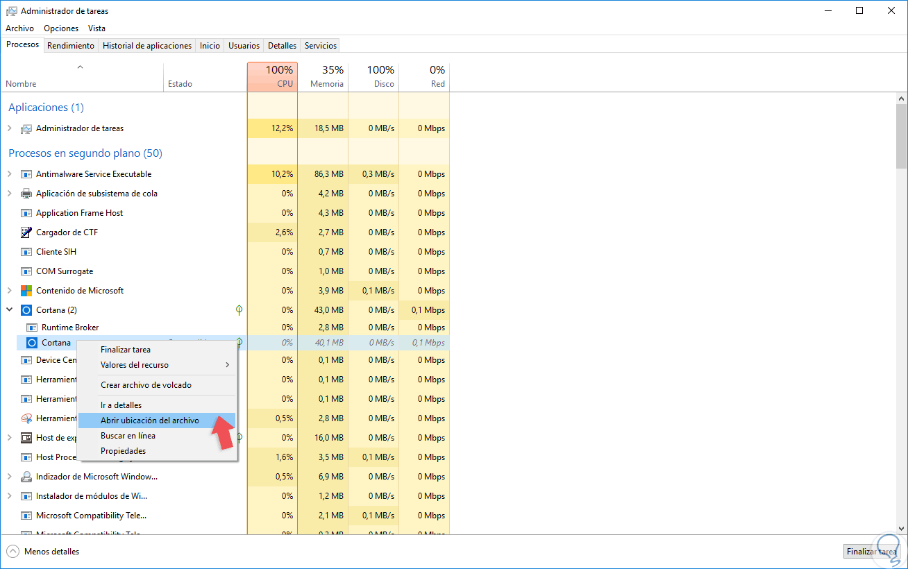 Si optamos por este método, accedemos al Administrador de tareas y allí en la pestaña Procesos, debemos ubicar el proceso Cortana y al dar clic derecho sobre el seleccionamos la opción “Abrir ubicación del archivo”: